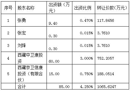 2014 年11 月18 日,北京京衛(wèi)信康科技股東會(huì)同意張勇、張宏、劉烽、西藏中衛(wèi)康投資、西藏京衛(wèi)信康投資(有限合伙)將各自持有北京京衛(wèi)信康科技的全部股權(quán)按照賬面凈資產(chǎn)轉(zhuǎn)讓給衛(wèi)信康有限,并于2014 年11 月15 日簽署股權(quán)轉(zhuǎn)讓協(xié)議,本次股權(quán)轉(zhuǎn)讓對價(jià)如下: